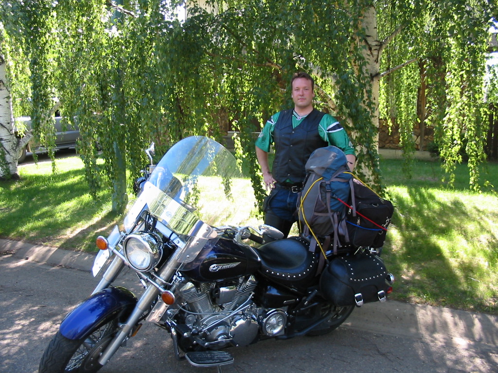 I left North Battleford quite late, mostly due to an iPod that suddenly developed an attitude problem that no amount of online troubleshooting was able to fix. After a 5:00pm departure that was supposed to be a 1:00pm departure, I hit the road armed only with those things that I could carry on the back of Silver- my 2003 Yamaha Roadstar Silverado 1600. This would be our third adventure.
