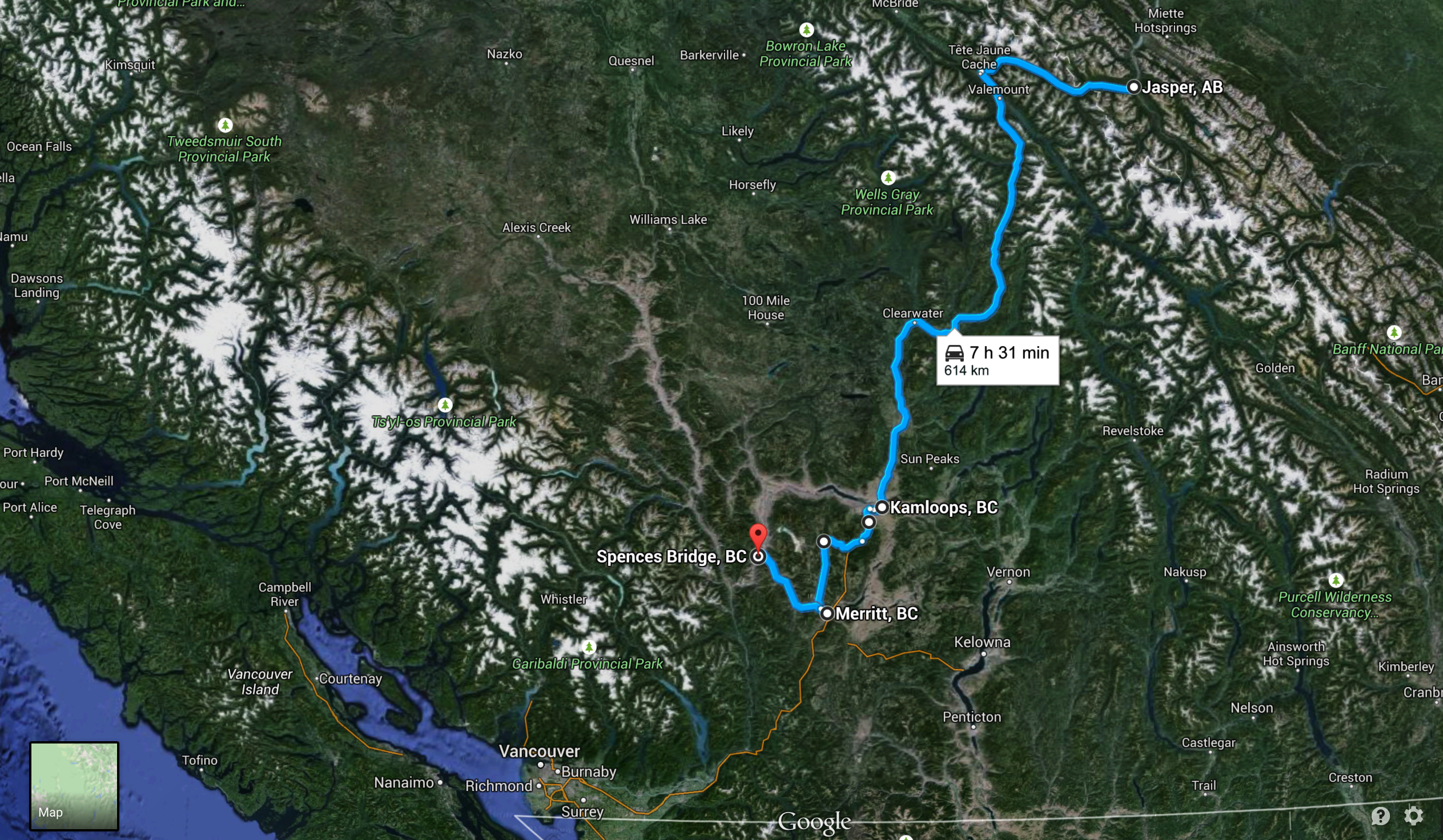 This is by far my favourite road into the British Columbia interior. Starting in the mighty Rocky and Caribou Mountains, the road follows the North Thompson River the entire way to Kamloops. As the scenery changes gradually over the course of 2-3 riding hours to that of the Shuswap Highlands the mountains get less rocky, and the air is much more dry. You can smell the dry forest in the air as the whole area feels like it could go up into flames with a single spark. No wonder this has been a bad year for forest fires.