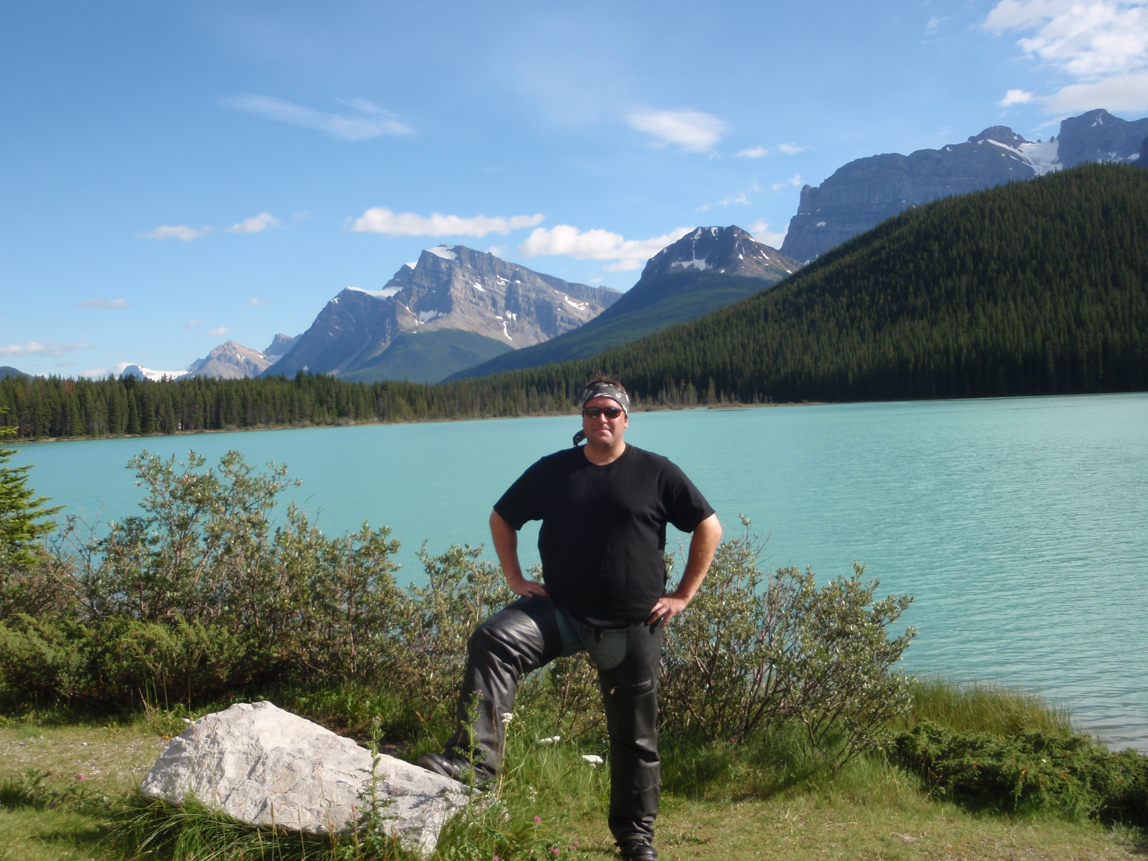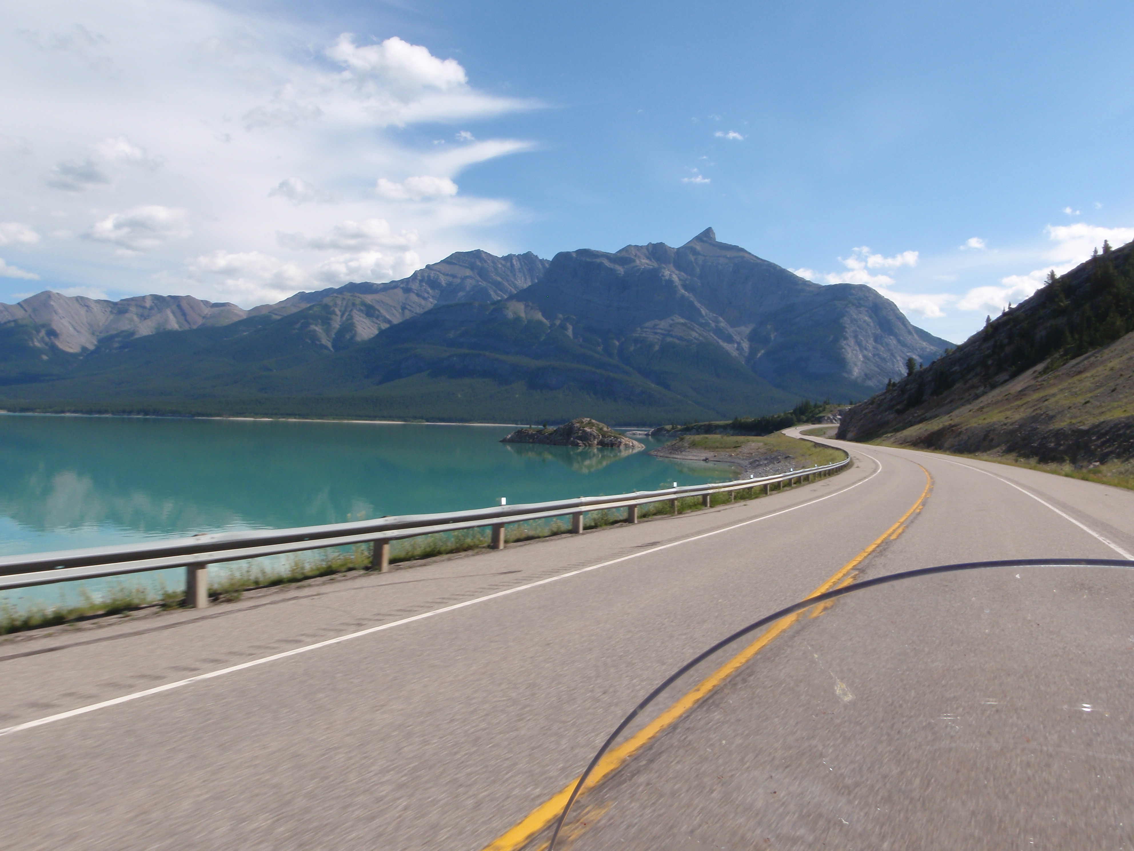 Riding west from Nordegg was an amazing experience. Abraham Lake and my North Saskatchewan River (yes, MY river) straddle the highway and the water is a deep turquoise colour from the minerals the water collects as it cascades down the mountains from the Columbia Glacier. I took many stops and just soaked in the scenery. The sleep I took in Nordegg proved to be a good idea because it gave me my second wind so I could enjoy every minute of my entry into the mountains.