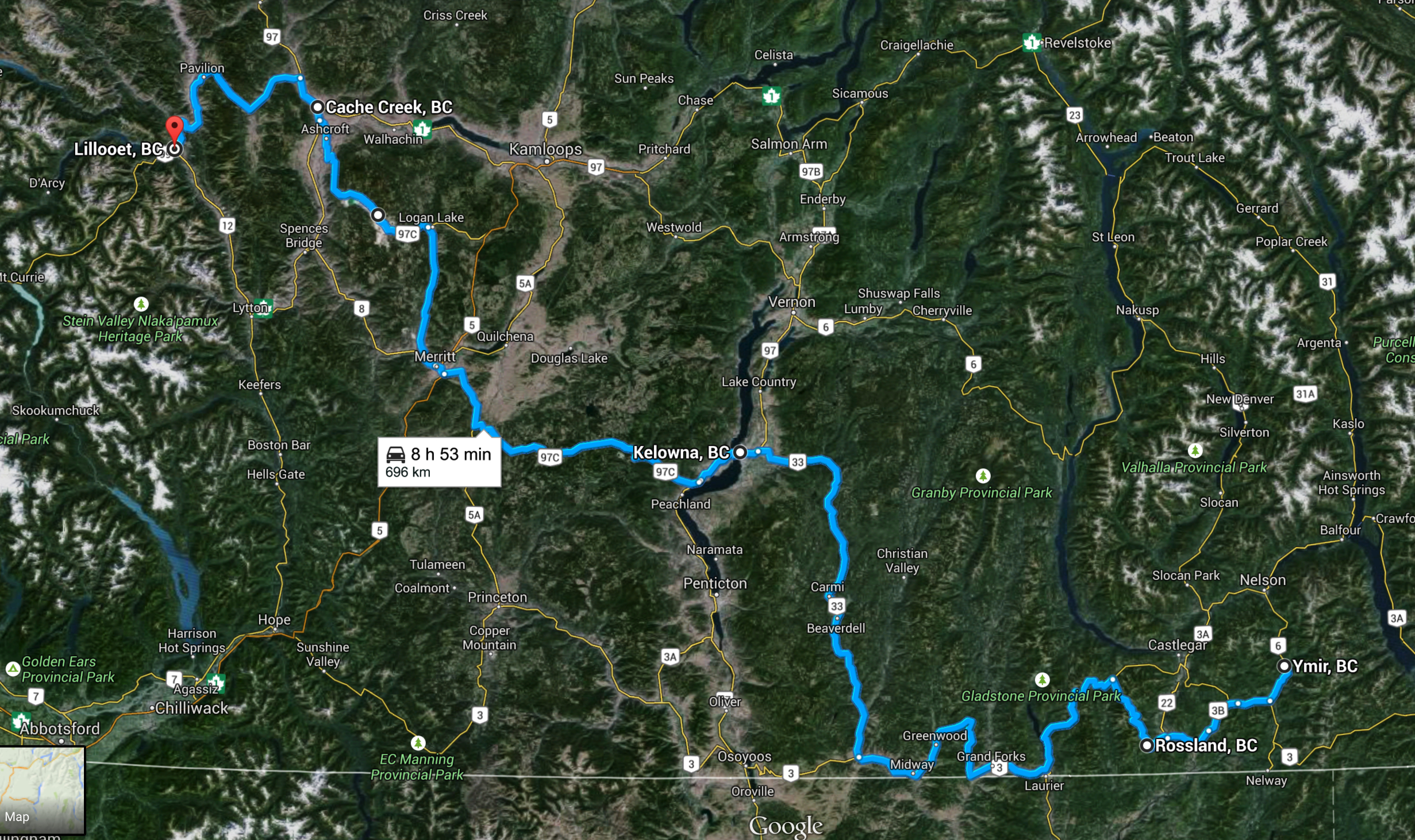 Monday, Aug 6, 2012 When I had planned the Road Warrior Tour this day was always intended to be the longest day of riding. It had to be a “bridge” day…a day to get from where I was to where I needed to be, with little disregard for any distractions along the way. The mission was simple: get from Ymir in the Kootenays to Lillooet- the bordertown nestled between the Thompson Plateau, the Coast Mountains, and the Fraser Canyon. Kelowna was the half-way point and there was a long way to go. In order to make it, I had to have lunch in Kelowna. Had to…or there’d be mountain riding in the dark. This must be avoided.