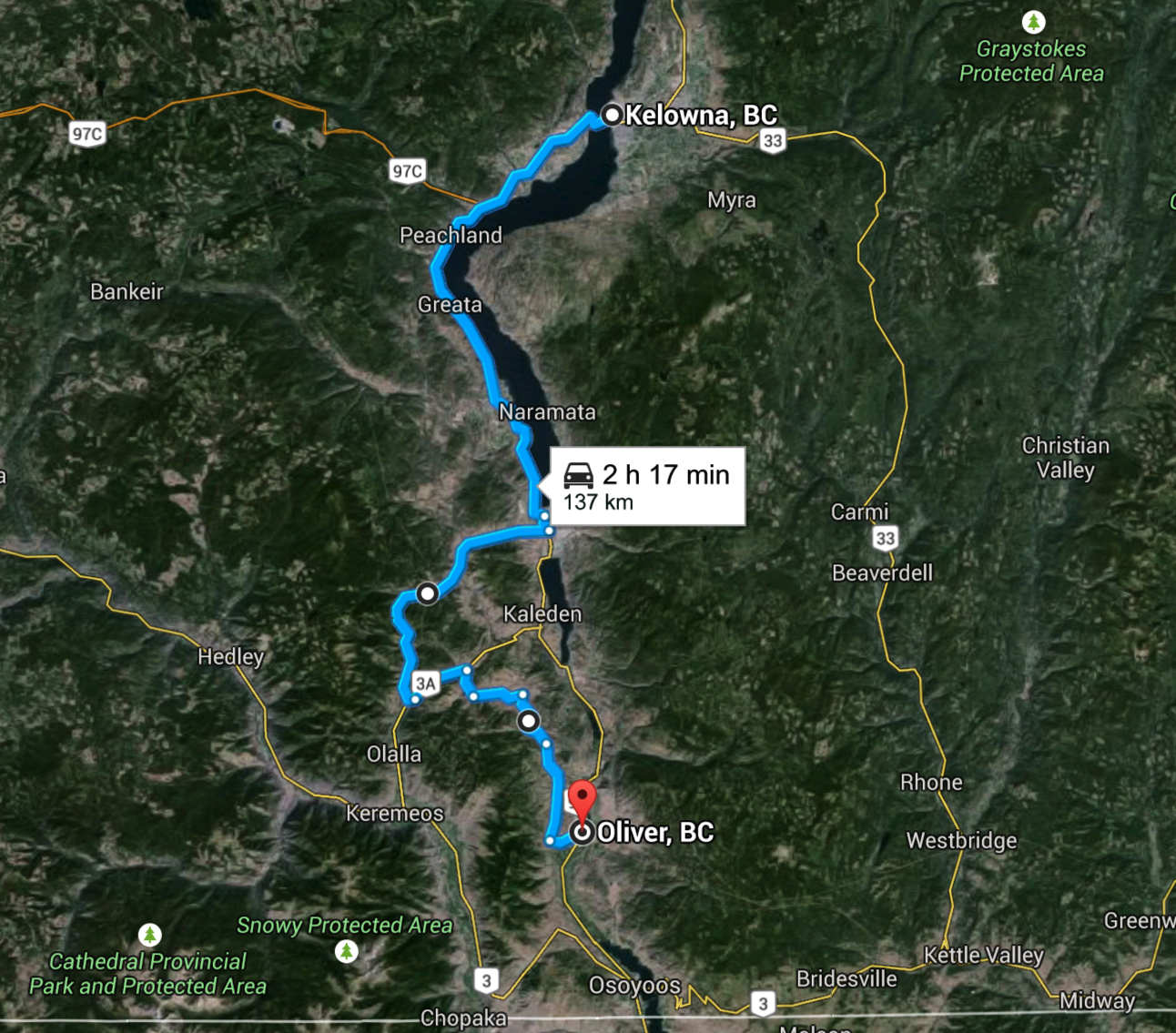 I woke up to warnings from Environment Canada about a massive heatwave throughout British Columbia…and I was going to be spending the day riding smack dab in the middle of the heat- from Oliver to Kelowna. While not a great distance geographically, I had planned to take some back roads to get there, and I knew braving the sun and the heat would be a real test of my endurance.