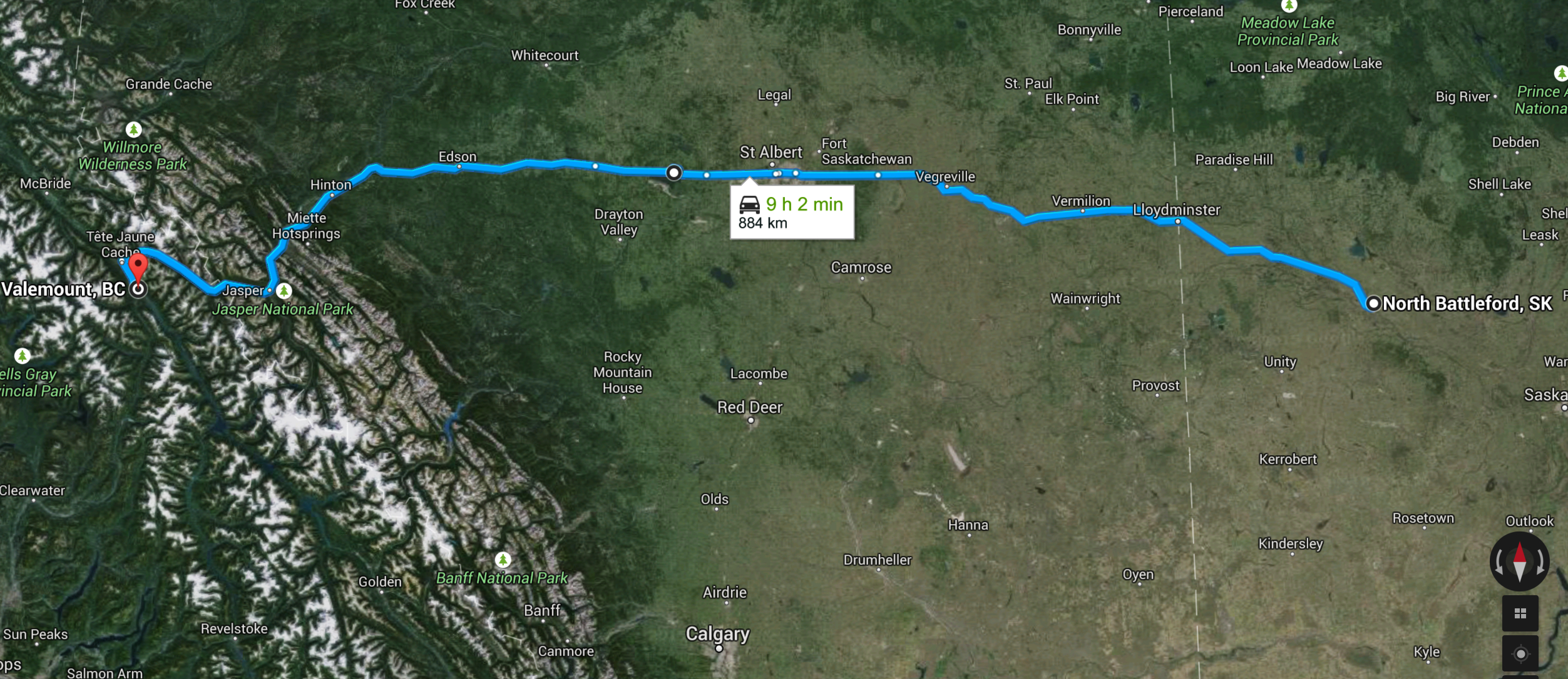 What was not different was getting a late start. Since we were both trying to cram this trip into an already hectic work schedule, our plan to leave North Battleford by 9:30 was a failure because we both had a bunch of last minute loose ends to tie up. We ended up leaving after 11:00, which was a very late start given that we had to get all the way to Valemount in BC on the first day.