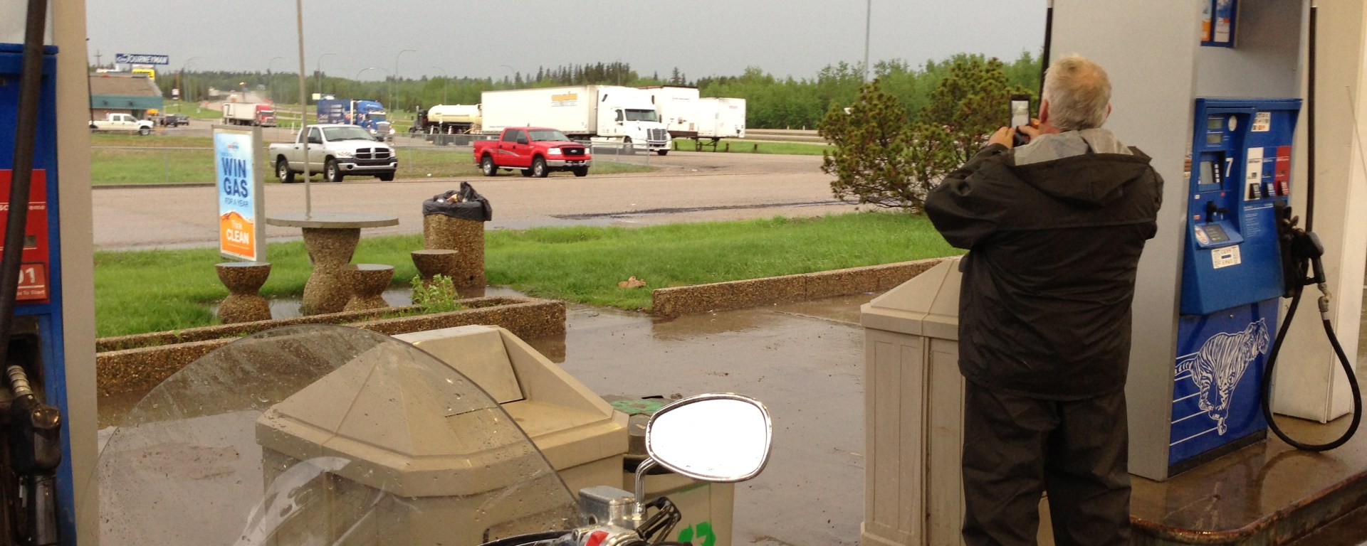 As soon as we got back on our bikes and headed out of Edmonton it began to rain. Hard. So hard that I lost sight of Greg in front of me and had to focus all of my attention on staying in my own lane of traffic on the highway. It rained hard all the way to Entwistle, where we stopped for fuel and to check on how the MacGyver air cleaner was adapting to the rain. No problems just yet.