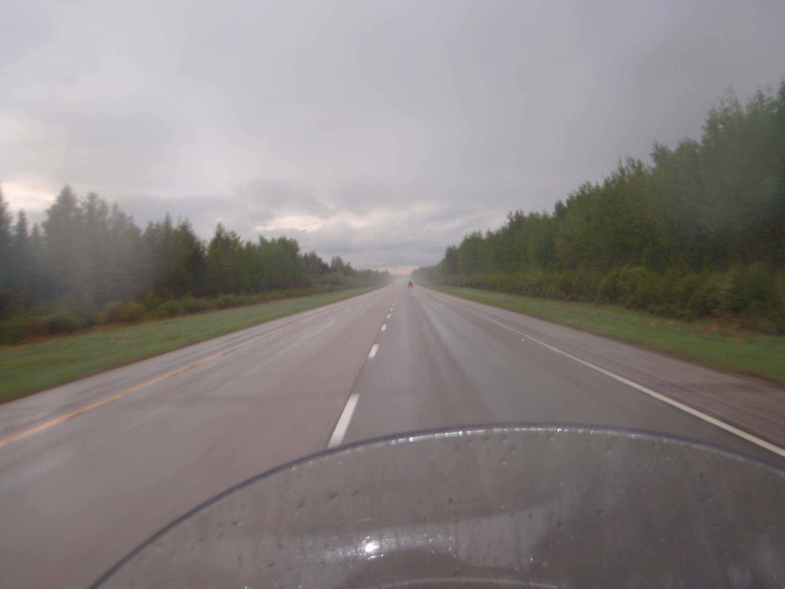 Just after Edson I had a heart-stopping scare. I was riding along when suddenly a deer darted out onto the highway from my right, and then decided to pull a 180 RIGHT IN FRONT OF ME. It was scrambling pretty bad as its hooves slipped on the wet asphalt. I could not swerve either because I wouldhave certainly put Silver down on his side. I steered slightly to my left but that deer was having serious trouble getting moved around. I was headed right for it and was bracing for certain impact, when at the last millisecond it gained its footing and was able to get out of my way. I missed it by about a foot. The whole episode lasted maybe 2 or 3 seconds but when the adrenaline kicks in the whole thing goes in slow motion. I had to shake that one off after it happened.