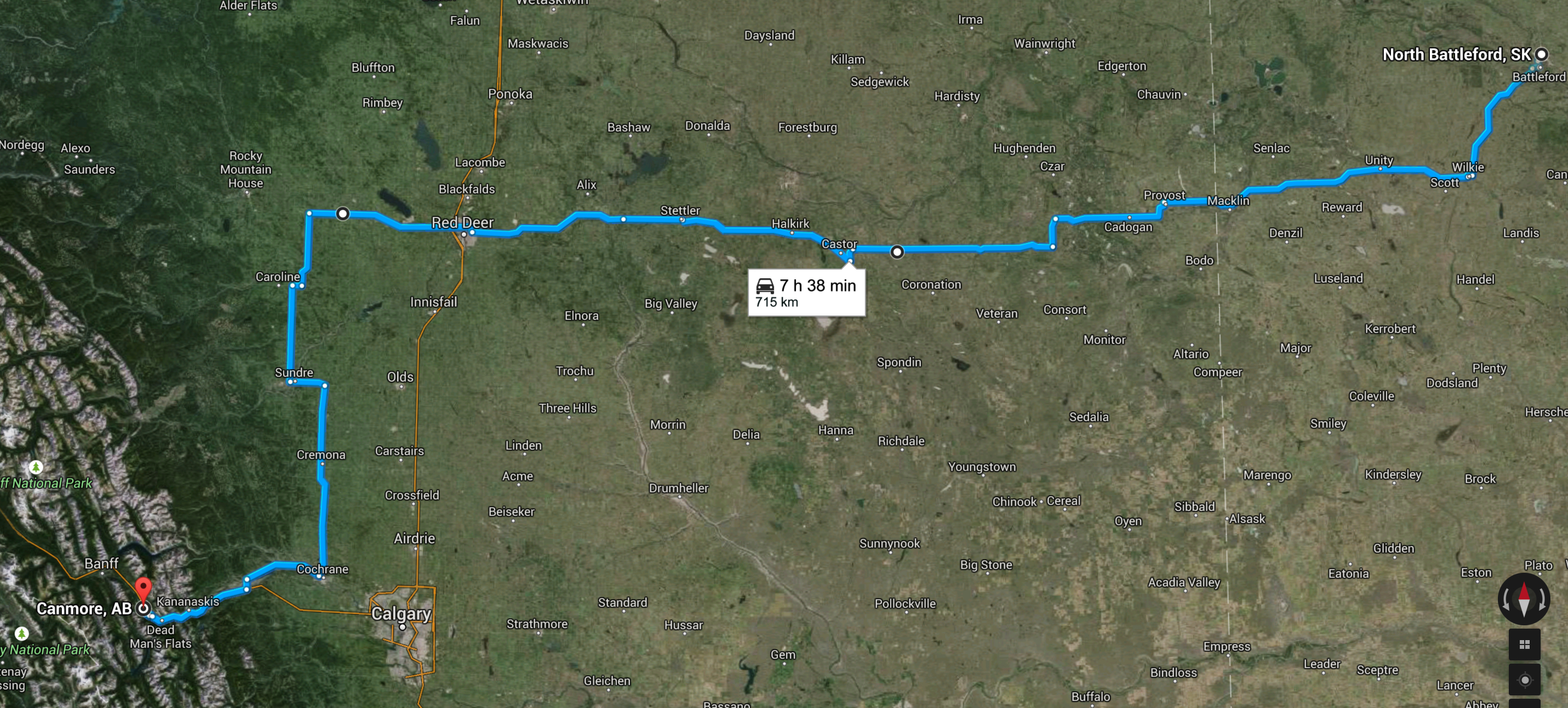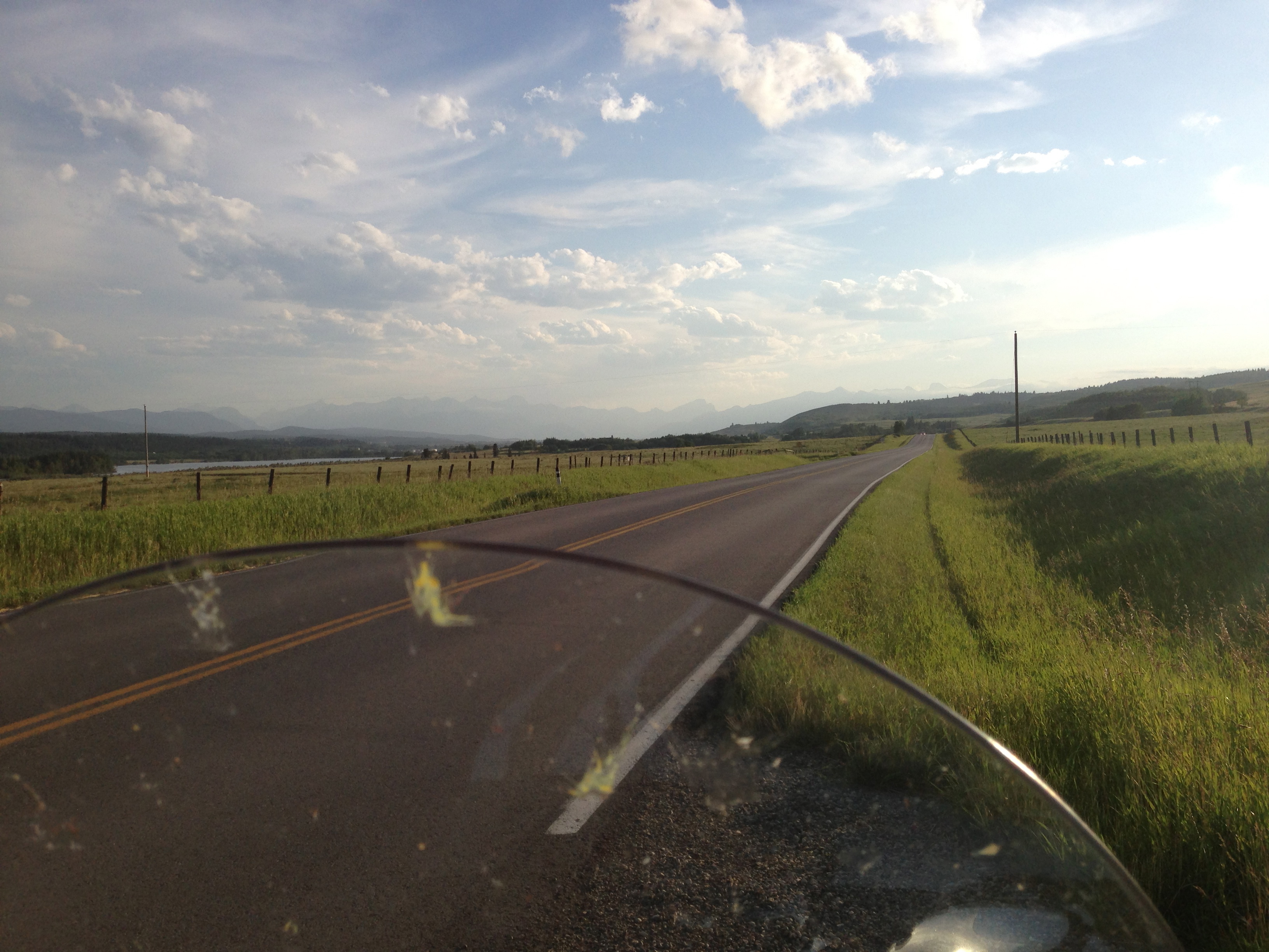 The goal for the first day was to get to Canmore. My friends Laura and Matt were moving from there and this would be my last chance to see Laura before she moved (Matt already did). I was packed and ready to go the night before and had hoped for an early 8:30am start, but a last minute chance to jam with my musician friends kept me up a little later than I expected, and getting up was a bit of a chore. I had to settle for a 10am takeoff. Still not bad.