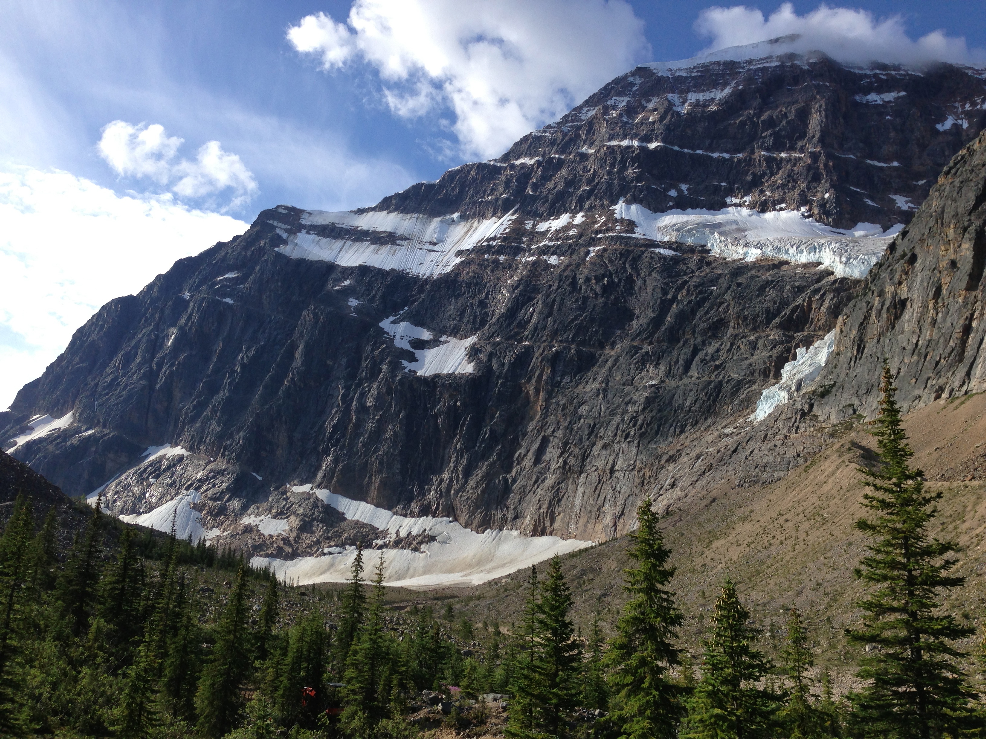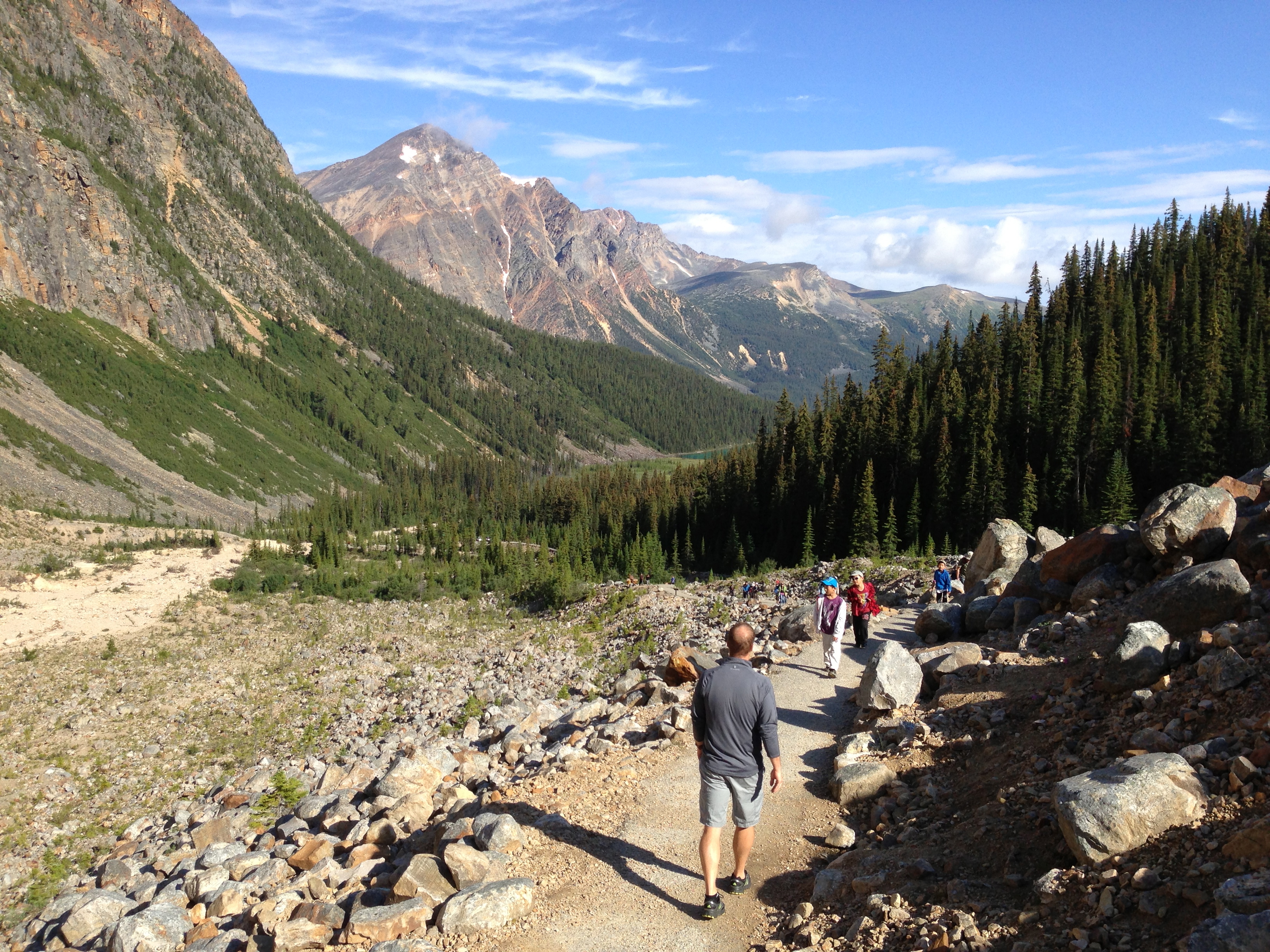 Reaching the site involves a steep mountain road with a sharp drop off that I would never attempt in the winter. It takes about a half hour to get to, but at the top of the site is a parking lot the bottom end of a trail head. After getting out of the car we read a few interpretive plaques to find that this site was a hiking trail that led up to viewing platform for a glacier on the side of Mount Edith Cavell. We hiked about halfway up before heading back. It was early in the morning but I was getting “punchy” with people on the trail…lots of tourist families with TODDLERS. Toddlers! Who brings babies to walk up a steep mountain trail with sharp drop offs, jagged rocks, and giant boulders…lots of shit to fall down and crack their heads on!? Some people are just morons.