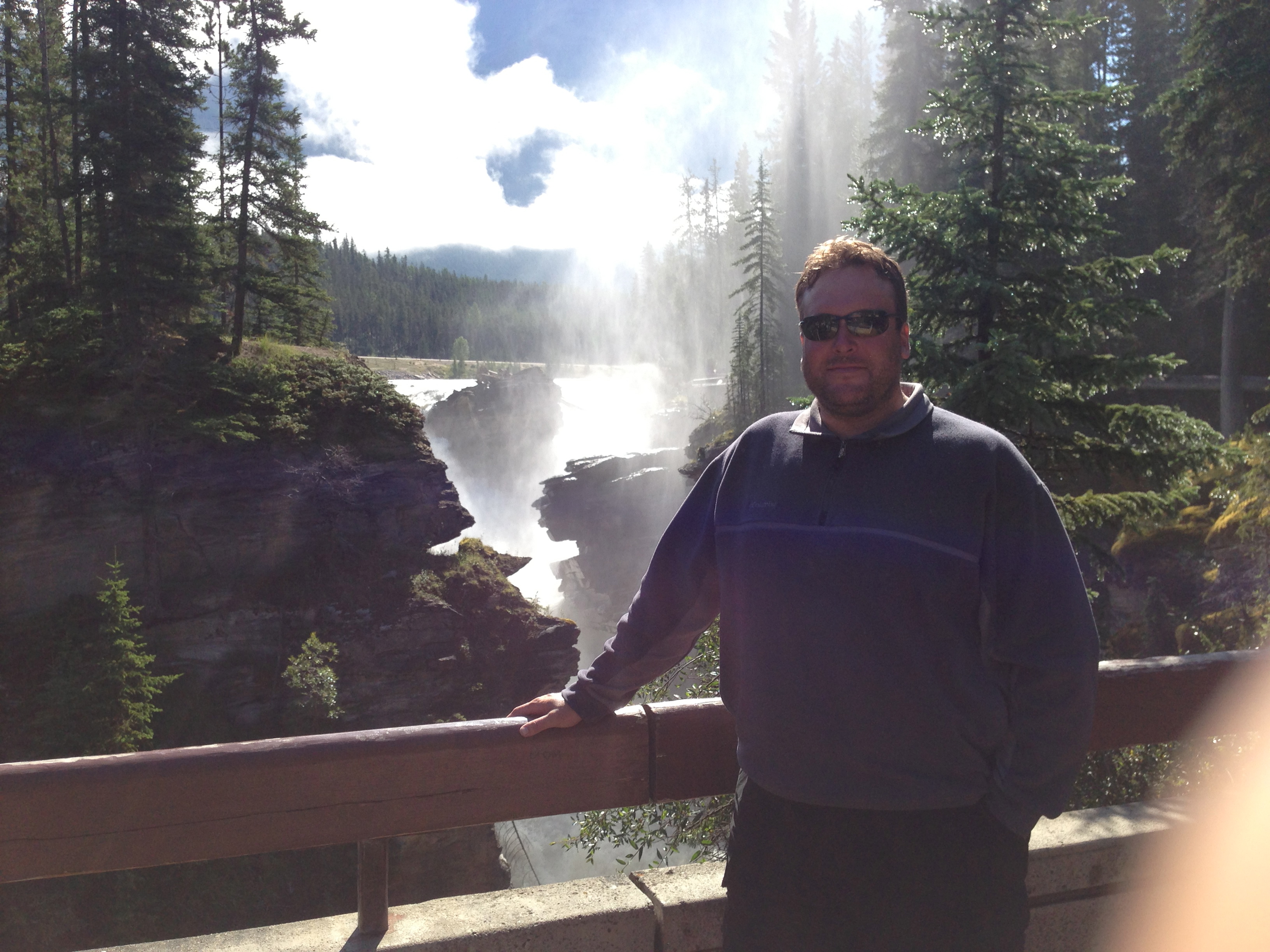 We left the site and headed back to the Parkway, where we headed south for about fifteen minutes to Athabasca Falls. I’ve been here several times but I never tire of the majesty of the place. It’s not just the Falls themselves- it’s the engineering of the parksite. We’re talking about bridges and walkabouts right next to a raging waterfall that would kill you in a minute if you fell down it. Some poor idiots have met their end there…mostly because they were jackasses messing around outside the marked fences and railings trying to be Mr. Cool Guy.
