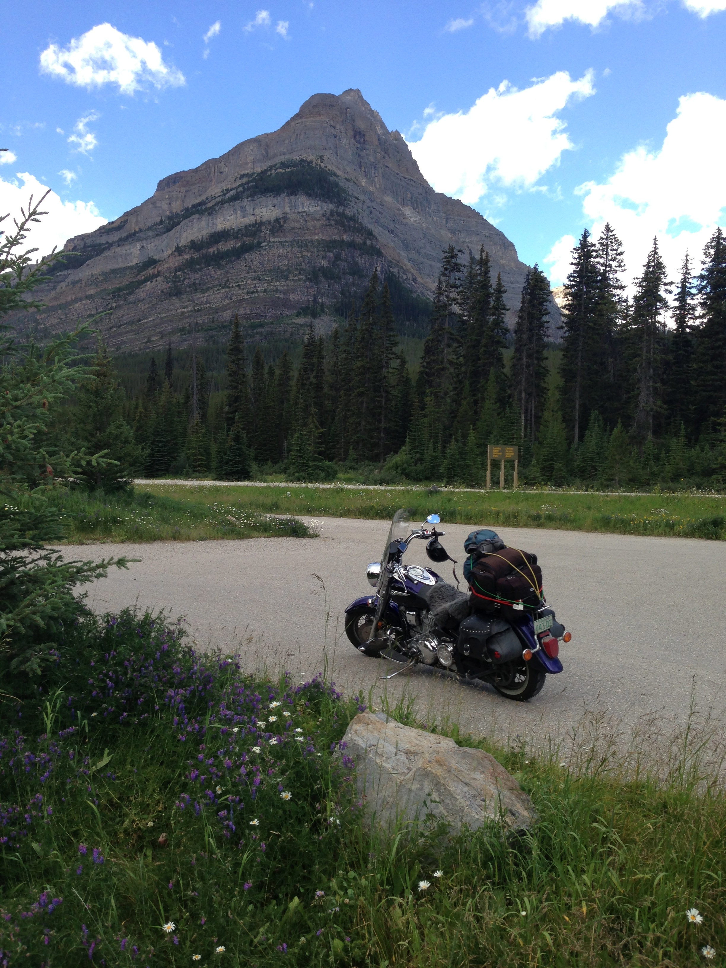 The parkway is a welcome relief from the congested highway #1. It is a little two-lane road cut into the forest and, while slower, offers some pretty great curves and twists. I didn’t mind the delay in time if it meant that I could enjoy this ride. After a half hour or so I could see Castle Mountain in the distance…this is where I would be taking a right turn to head west into Kootenay National Park.