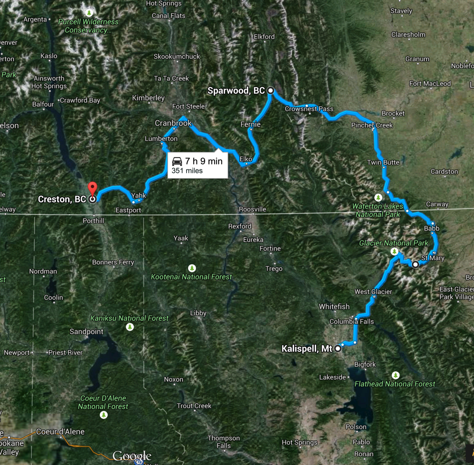 When I reached the highway it was about 3pm and I didn’t reach Cranbrook until about 7. Crossing the Crowsnest Pass (only 4455 feet) represented the third time in about 24 hours that I’ve crossed through the Rocky Mountains and over the Continental Divide. After reaching Cranbrook I was back in the Rocky Mountain Trench, and now would be ducking south of the Purcells to head into the Kootenays.