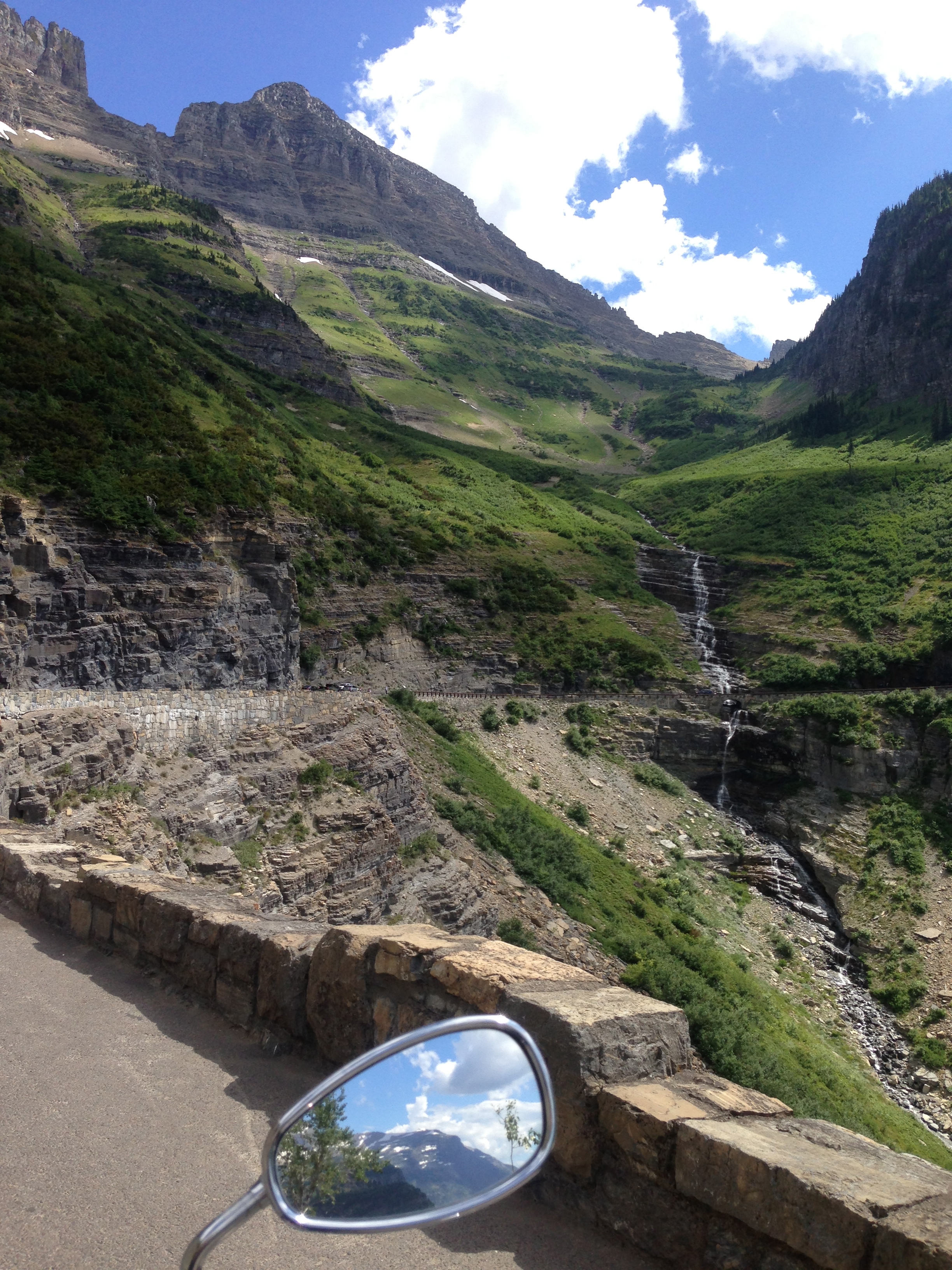There are no words to describe how amazing this road is. It’s not a highway either…no trucks or campers allowed…just bikes and cars. The road is cut into the side of the Going to the Sun Mountain and climbs up to a stellar 6,646 feet (over 1100 feet higher than Vermillion Pass I rode over yesterday). The road gets right up to the tree line, and the only thing stopping you from plummeting down a mountain is a two foot high brick wall.