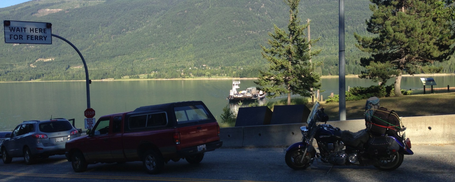 The road between Vernon and the Needles Ferry on the Arrow Lakes is in the top 10 of any motorcyclist worth their salt in BC. You start out leaving Vernon in wide valleys of dry grasses and brown trees…as you head further east your elevation starts to climb as you head over the Monashees and over Monashee Pass (with a modest elevation of 3952 feet). Once you clear the pass the road tightens right up and you are back to characteristic Kootenay riding…heavy forests, deep canyons, the freshest air on the planet, and beautiful vistas. After a few hours after leaving Vernon you approach Needles to take a ferry across the Arrow Lakes.