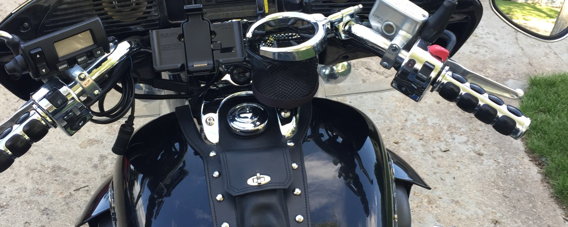I made several modifications to Midnight. That backrest was custom ordered. The tank bib and chrome tank cover were custom ordered. There were these weird little flame stickers running all through the bike that I removed, and I changed the external speakers to something with a little more pop.