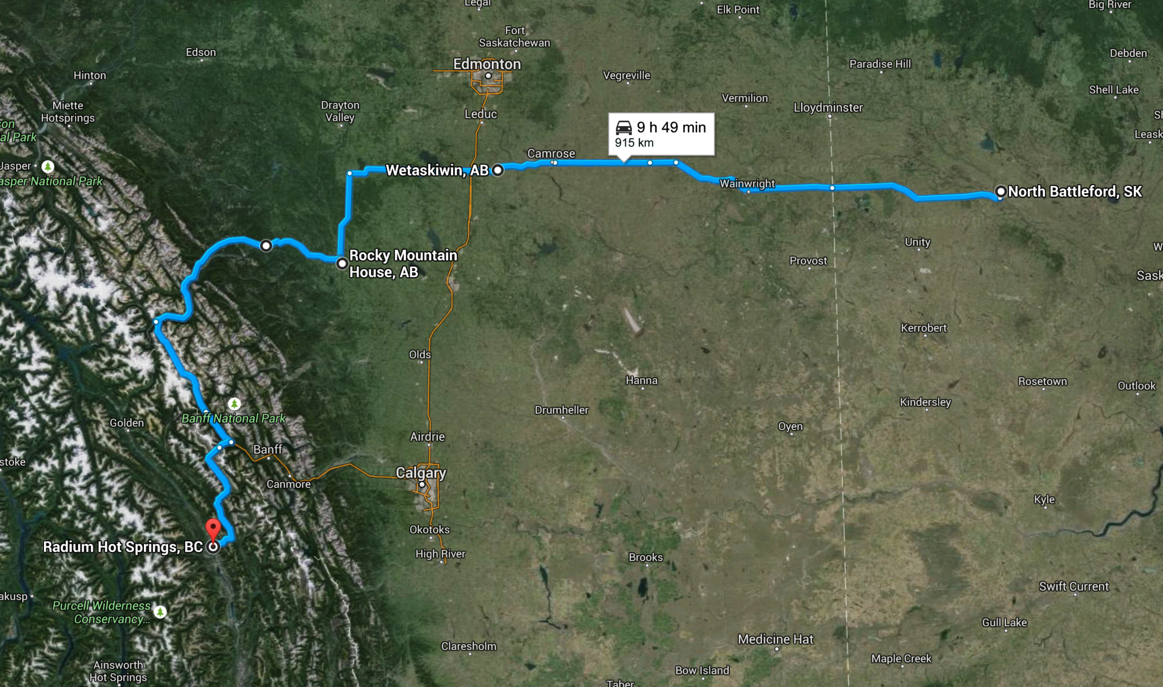 To get there at a decent hour I had to leave by 7am. I was up at 6:00 to get ready but I just wasn’t packed enough yet and I wasn’t able to get on the road until 8:00. I decided to take the Wainwright/Wetaskiwin route, so I could enjoy entering the Rockies using the David Thompson highway.