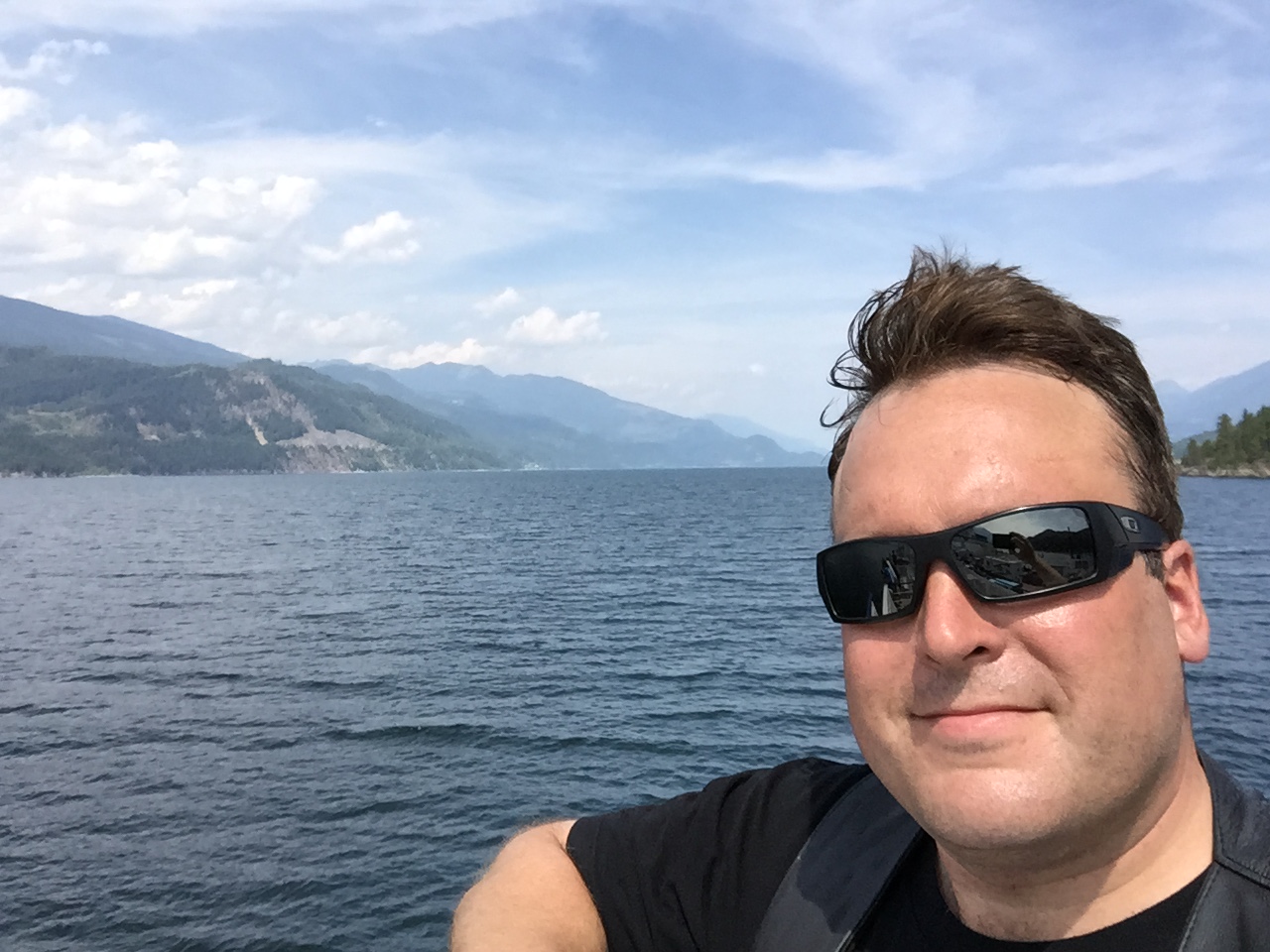 By the time the ferry landed at Balfour it was about 1:30 and it was 30 degrees. I rode to Nelson without stopping, and then rode downtown in search of something for lunch. I found a food truck and ordered a wild salmon wrap…when you’re in the Kootenays you have to find good food…Subway won’t cut it here.