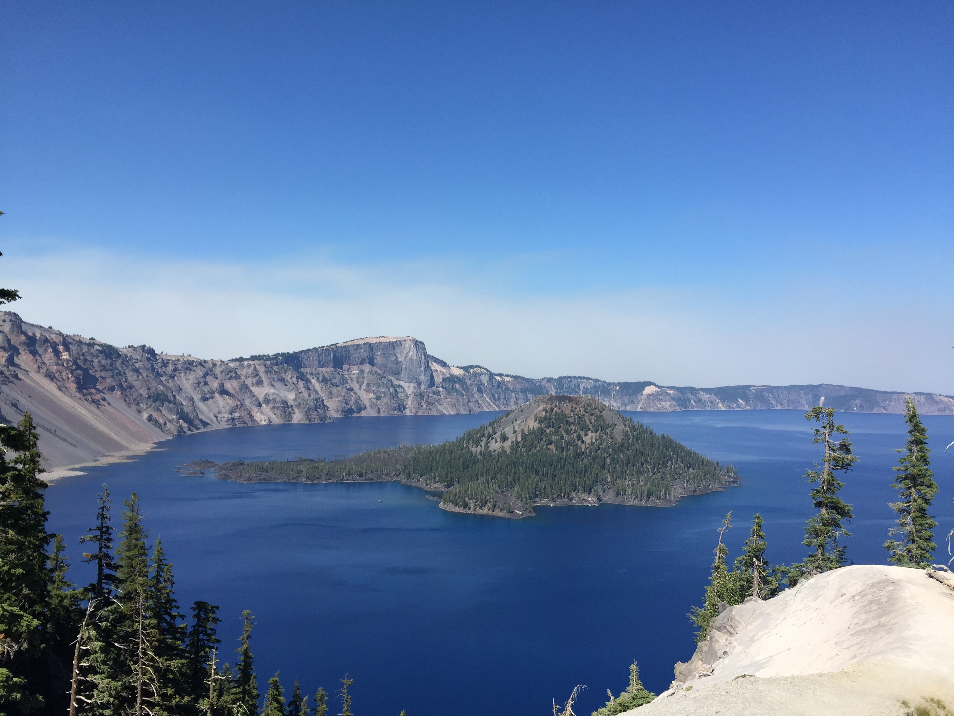 Crater Lake is a lake inside a crater, so it is named well. It should actually be called Caldera Lake because it is what remains of a volcano called Mount Mazama. About 8000 years ago some magma chambers around the peak started to spew, and the entire peak of the volcano slid down those chambers and collapsed on itself, essentially plugging those chambers and creating a massive crater in the middle of the volcano where the peak used to be. The volcano didn’t go dormant, and so some lava still flowed out and created new peaks inside the crater. Over time the crater got filled with rain and snow, and so now there exists an equilibrium between evaporation and accumulation (there are no streams in or out of the crater)…the equilibrium is such that a lake can be sustained, albeit with seasonal ebbs and flows in water depth, entirely by the accumulation/evaporation balance. There’s actually many of these around the world but this was the first one I’d seen.