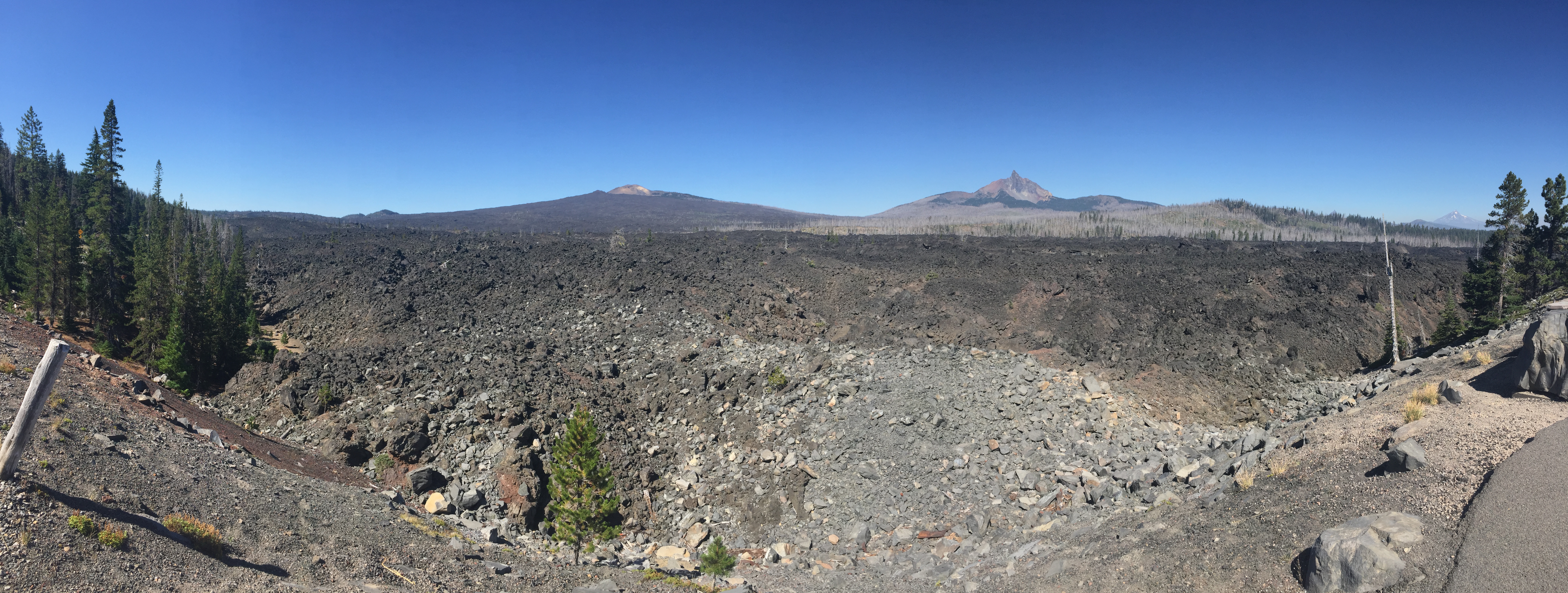 I wasn’t disappointed. I rode hwy 242 from Sisters (named for The Three Sisters…three volcanoes that loom to the south), and ended up on a narrow little road that was heavily treed (for the desert) and ascended rather rapidly. I was starting to enjoy the ride when I suddenly turned a corner and was confronted with a jaw dropping scenery, the likes of which I had never seen. As far as I could see was nothing but a black, rocky nothingness. The rocks were jagged and hard but they looked as if they flowed down the mountains in the distance. Looks were not deceiving either…that mountain is a volcano and this was its lava flow. It has hardened and cracked and looks like this: